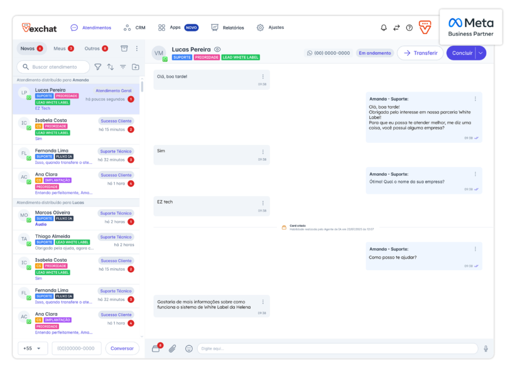 Cada conversa é direcionada para o setor correto, com etiquetas e prioridades definidas.