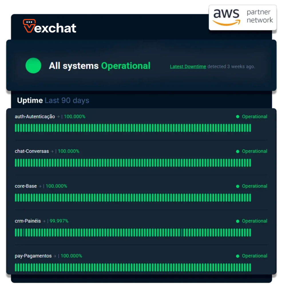 O Vex Chat opera em ambiente seguro, escalável e preparado para suportar o crescimento da sua operação sem comprometer desempenho.